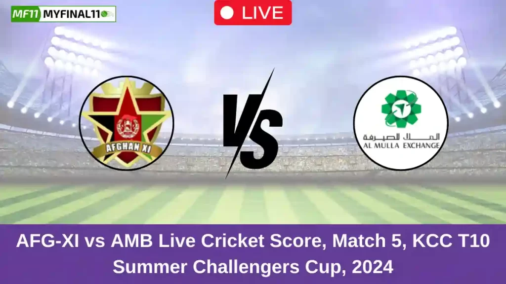 AFG-XI vs AMB Live Cricket Score — The Afghan XI (AFG-XI) vs Al Mulla Exchange – B (AMB) Match 5 in the KCC T10 Summer Challengers Cup is set for August 15, 2024 12:30 AM IST, at Sulaibiya Cricket Ground.