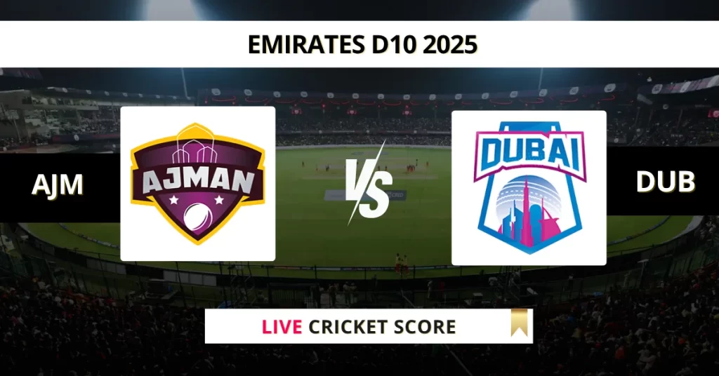 AJM vs DUB Live Cricket Score — The Ajman (AJM) vs Dubai (DUB) Match 34 in the Emirates D10 Tournament 2025 is set for May 28, 2025, 6:30 PM IST, at Sharjah Cricket Stadium.