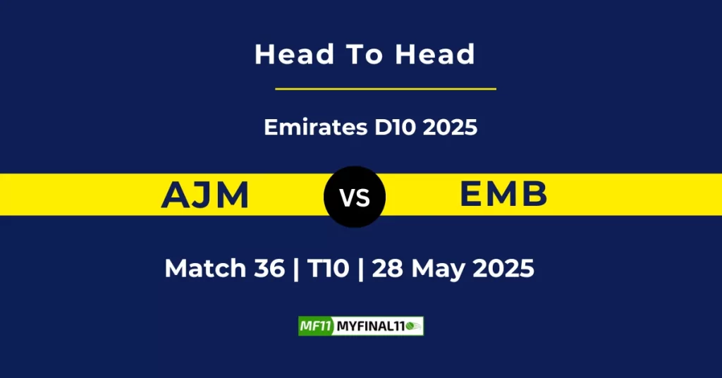 Get all the AJM vs EMB player stats, records, and head-to-head between Ajman (AJM) and Emirates Blues (EMB). This match is part of the Emirates D10 Tournament 2025. It will be held at Sharjah Cricket Stadium, Sharjah, on May 28, 2025, at 11:30 PM IST