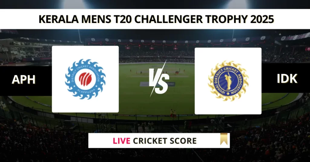 APH vs IDK Live Cricket Score — The DCA Alappuzha (APH) vs DCA Idukki (IDK) Match 1 in the Kerala Mens T20 Challenger Trophy 2025 is set for May 16, 2025, 8:45 AM IST, at St Xavier’s College Ground.