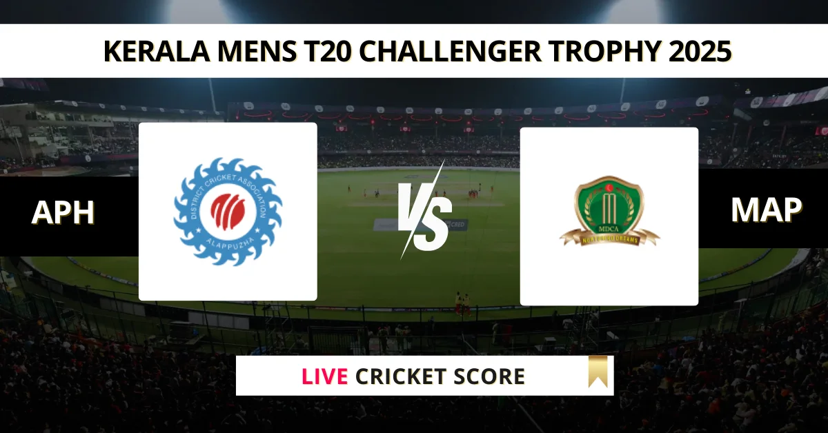 APH vs MAP Live Cricket Score — The DCA Alappuzha (APH) vs DCA Malappuram (MAP) Match 5 in the Kerala T20 Men’s Challenger Trophy 2025 is set for May 18, 2025, 8:45 AM IST, at St Xavier’s College Ground, Thiruvananthapuram.