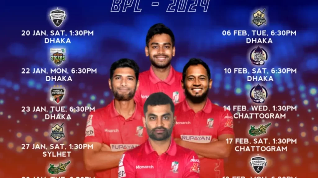 The 10th edition of the Bangladesh Premier League 2024 tournament will be held from January 19 to February 21. Seven teams, namely Chattogram Challengers, Comilla Victorians, Durdanto Dhaka, Fortune Barishal, Khulna Tigers, Rangpur Riders, and Sylhet Strikers, will participate in this tournament. Between January 19 and February 21, a total of 42 matches will be played among these 7 teams in the league stage. After the league stage matches, only 4 teams will qualify for the playoffs, where they will compete in the qualifier and semifinal matches.