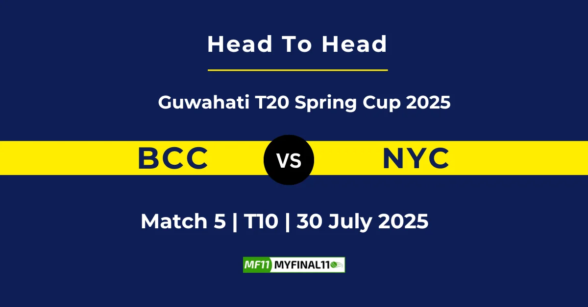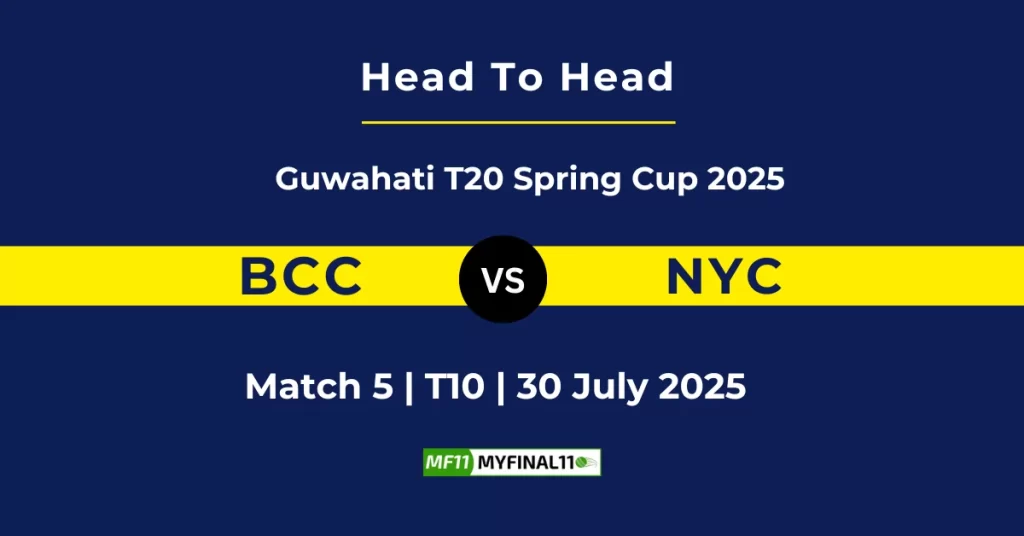 BCC vs NYC Player Battle, Head-to-Head Team Stats & Records and more: Today in Guwahati T20 Spring Cup (2025), Bud CC (BCC) will take on 91 Yard Club (NYC) at Judges Field, Guwahati, on 30th July 2025 at 9:00 AM.