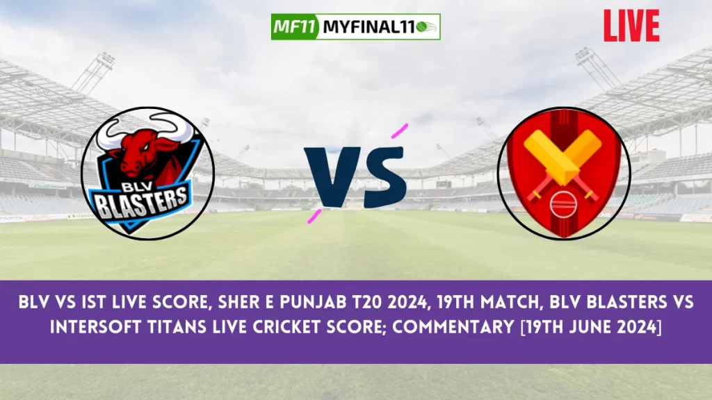 Get live score updates for the BLT vs IST match as BLV Blasters (BLT ) take on Intersoft Titans (IST ) in the 19th Sher E Punjab T20 Cup, 2024 match. Follow the live score and ball-by-ball commentary here. The match will begin on June 19th, 2024, at 03:30 PM BLT and will be hosted at Punjab Cricket Association IS Bindra Stadium in Mohali, Chandigarh. Live Streaming of this match is available on the Fancode, and for BLT vs IST Live Cricket scorecard ball-by-ball commentary, Visit Here.