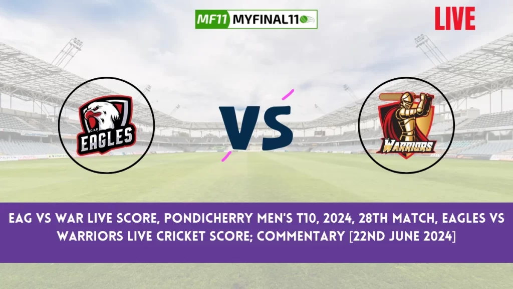 Get live score updates for the EAG vs WAR match as Eagles (EAG ) take on Warriors (WAR ) in the 28th Pondicherry Men’s T10, 2024 match. Follow the live score and ball-by-ball commentary here. The match will begin on June 22nd, 2024, at 08:30 AM IST and will be hosted at Cricket Association Puducherry Ground 4, Puducherry. Live Streaming of this match is available on the Fancode, and for EAG vs WAR Live Cricket scorecard ball-by-ball commentary, Visit Here.