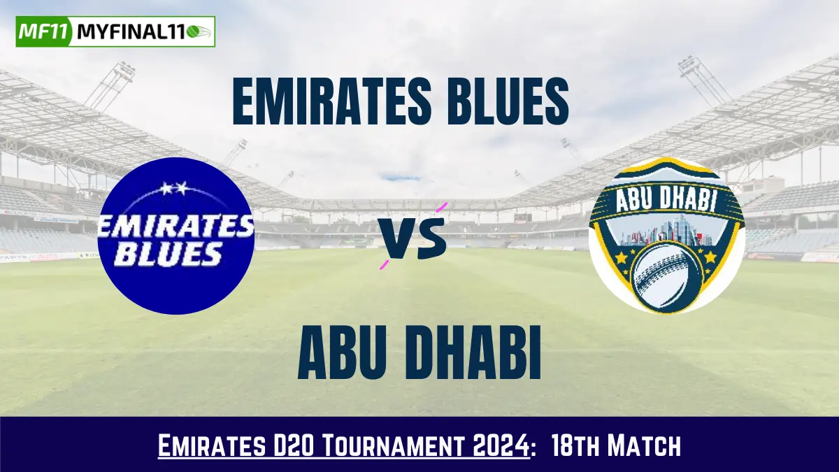 Get ready for an exciting clash in Match 18 of the Emirates D20 Tournament 2024, where Emirates Blues (EMB) will face Abu Dhabi (ABD) at The Sevens Stadium, on October 31, 2024, at 11:00 PM IST. Both teams are aiming to win and improve their position in the group standings.