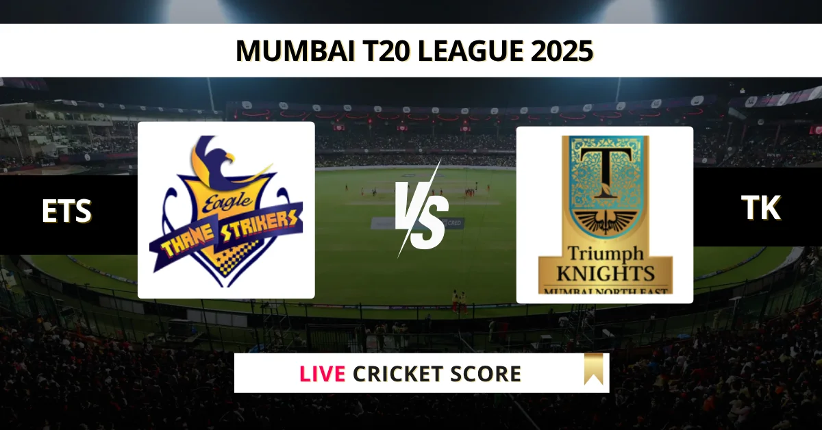 ETS vs TK Live Cricket Score — The EAGLE THANE STRIKERS (ETS) vs Triumph Knights MNE (TK) Match 3 in the T20 Mumbai 2025 is set for June 4, 2025, 5:30 PM IST, at Dr DY Patil Sports Academy, Mumbai.