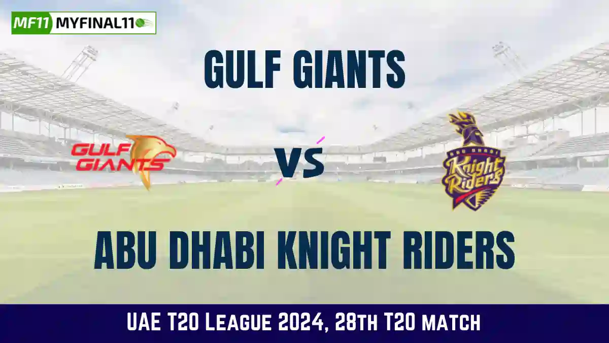 GUL vs ABD Live Score: Gulf Giants is set to take on Abu Dhabi Knight Riders on 10th Feb 2024, at Dubai International Cricket Stadium, Dubai. If you are looking for Today’s GUL vs ABD live cricket score then you are at the right place. The 28th Match of UAE T20 League, 2024 Live scorecard of Gulf Giants vs Abu Dhabi Knight Riders with a Match report, ball-by-ball commentary, & highlights of Gulf Giants vs Abu Dhabi Knight Riders Match details, Match preview, points table position.