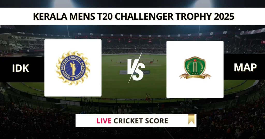 IDK vs MAP Live Cricket Score — The DCA Idukki (IDK) vs DCA Malappuram (MAP) Match 7 in the Kerala T20 Men’s Challenger Trophy 2025 is set for May 19, 2025, 8:45 AM IST, at St Xavier’s College Ground, Thiruvananthapuram.