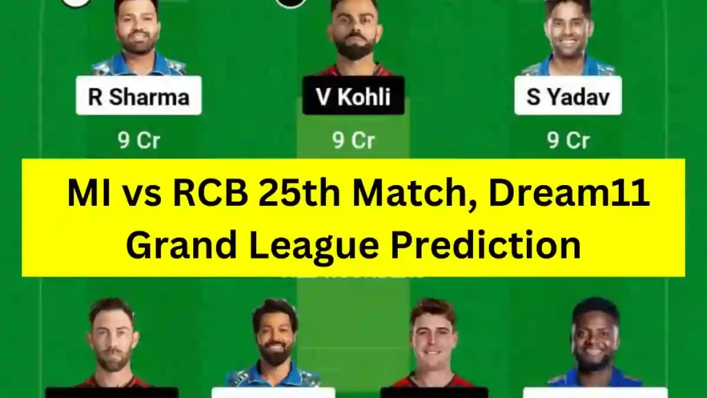 Our fantasy cricket team has finalized the following players for their respective roles: I Kishan as the wicket-keeper, R Sharma, V Kohli, and S Yadav as the batters, and G Maxxwell, H Pandya, C Green, and R Shepherd as the all-rounder. We have also selected J Bumrah, R Topley, and G Coetzee as the bowlers. V Kohli and R Sharma were named captain and vice-captain in our fantasy team.![IPL 2024, 25th Match: MI vs RCB Dream11 Grand League (GL) Prediction, Trump Pick, Must Have Pick C & VC [11th Apr 2024]](https://myfinal11.in/wp-content/uploads/2024/04/MI-vs-RCB-Grand-League-Prediction-574x1024.webp)