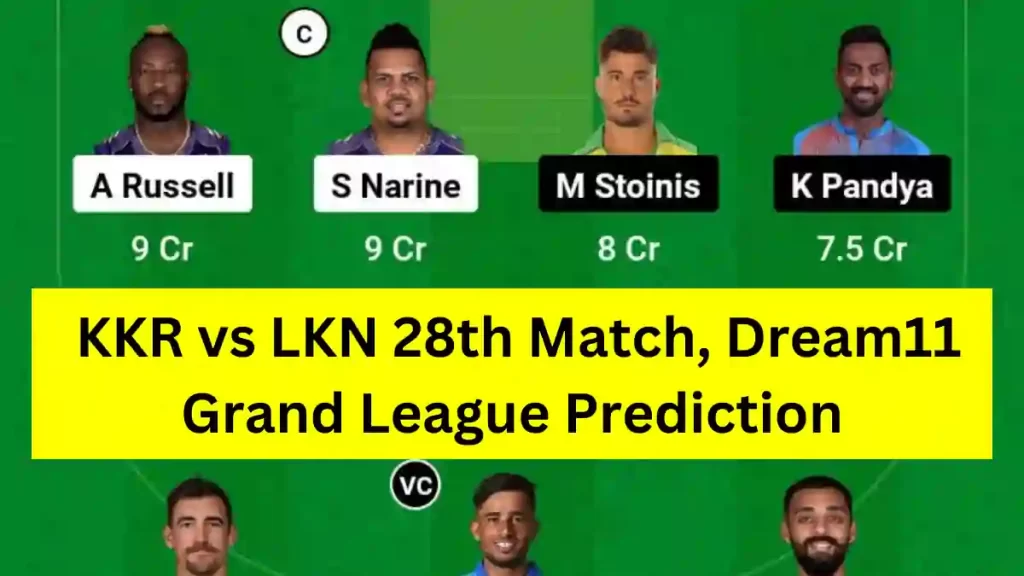 KKR vs LKN Dream11 Grand League Prediction, IPL 2024 – The 28th Match of the Indian Premier League 2024 (IPL) KKR vs LKN Dream11 GL Prediction. KKR vs LKN Grand League Team. If you are searching for the GL/ML Grand League Mega League Contest Dream11 Prediction of the KKR vs LKN 28th Match and want to learn about the must-have picks, you have come to the right place. This match is scheduled to take place on 14th Apr 2024, at 03:30 PM IST at Eden Gardens, Kolkata.