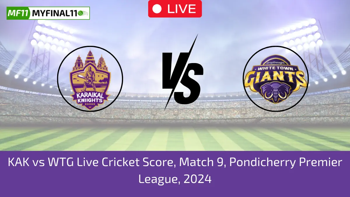 KAK vs WTG Live Cricket Score — The Karaikal Kniights (KAK) vs White Town Giants (WTG) Match 9 in the Pondicherry Premier League is set for August 9, 2024 2:45 PM IST, at Cricket Association Puducherry Siechem Ground.