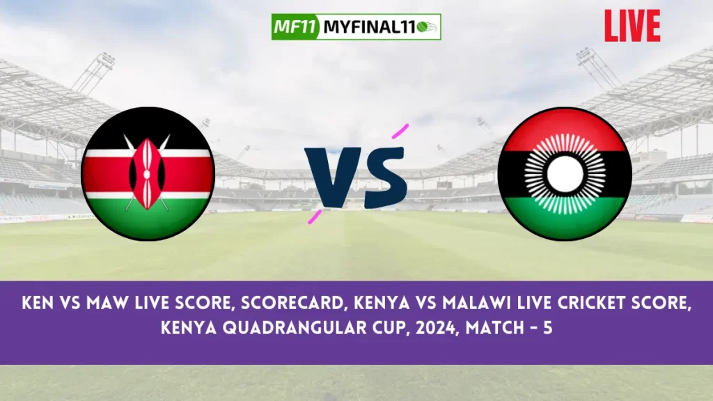 KEN vs MAW Live Score — Today’s 5th Kenya Quadrangular Cup T20 match between Kenya (KEN) and Malawi (MAW) will be held on July 1, 2024, at Aga Khan Sports Club Ground, Nairobi. It will start at 12:00 PM IST. Cricket fans can follow the live cricket score, scorecard, and ball-by-ball match commentary on myfinal11. Live streaming for this match is available on the Fancode app/website.