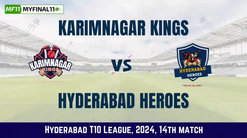 KKG vs HYH Dream11 Prediction Today Match: Karimnagar Kings (KKG) vs Hyderabad Heroes (HYH ) are scheduled to compete in the 14th match of the Hyderabad T10 League 2024 on Friday, 22nd March 2024. This match will be hosted at MRR Cricket Ground, Hyderabad at 11:15 AM IST. Karimnagar Kings is in 2nd place with three wins from four matches whereas Hyderabad Heroes is in 5th place with one win from four matches.