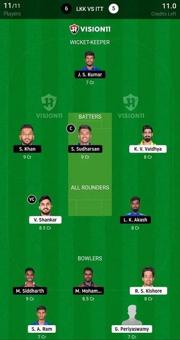 IDream Tiruppur Tamizhans (ITT ) In-Form/Key Player For Your LKK vs ITT Dream11 Team: