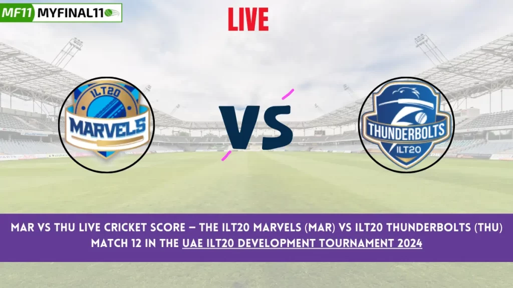 MAR vs THU Live Cricket Score — The ILT20 Marvels (MAR) vs ILT20 Thunderbolts (THU) Match 12 in the UAE ILT20 Development Tournament 2024 is set for October 12, 2024, 10:30 PM IST, at ICC Academy.