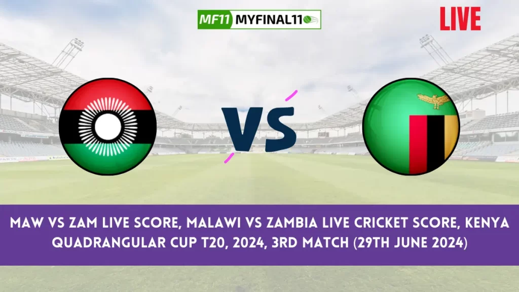 Get live score updates for the MAW vs ZAM match as Malawi (MAW) take on Zambia (ZAM) in the 3rd Kenya Quadrangular Cup T20, 2024 match. Follow the live score and ball-by-ball commentary here. The match will begin on June 29th, 2024, at 12:00 PM IST and will be hosted at Aga Khan Sports Club Ground, Nairobi. Live Streaming of this match is available on the Fancode, and for MAW vs ZAM Live Cricket scorecard ball-by-ball commentary, Visit Here.