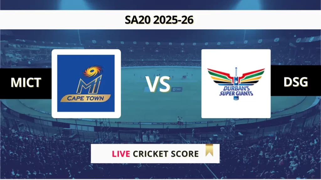 MICT vs DSG Live Score: Stay updated with MI Cape Town vs Durban Super Giants Cricket Team real-time scores and ball-by-ball coverage of the Match 1 in the SA20 2025. The MI Cape Town cricket team will face off against the Durban Super Giants cricket team at Newlands on December 26, 2025, at 9:00 PM IST.