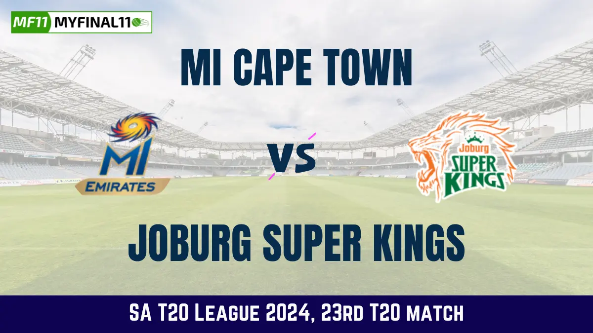 MICT vs JSK Live Score Today MICT vs JSK Live scorecard Live Cricket Score report & scorecard, SA T20 League 2024 Catch live cricket score, ball-by-ball commentary, & highlights of the 23rd T20 Match of SA T20 League – MI Cape Town is set to take on Joburg Super Kings at Newlands, Cape Town at 09:00 PM IST. If you are looking for Today’s MICT vs JSK live cricket score then you are at the right place.