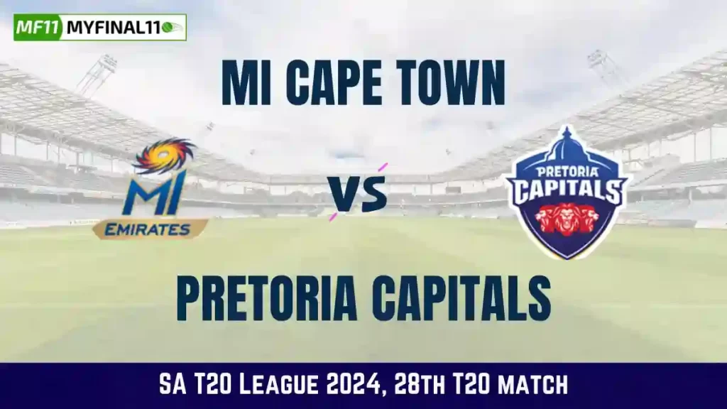 MICT vs PC Live Score Today MICT vs PC Live scorecard Live Cricket Score report & scorecard, SA T20 League 2024 Catch live cricket score, ball-by-ball commentary, & highlights of the 28th T20 Match of SA T20 League – MI Cape Town is set to take on Pretoria Capitals at Newlands, Cape Town, starting at 05:00 PM IST. If you are looking for Today’s MICT vs PC live cricket score then you are at the right place.