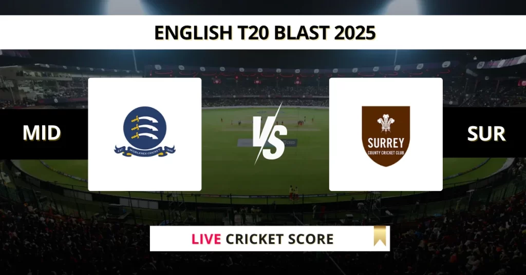 Get Live Score update of MID vs SUR: Track the live match updates, scorecard, and key moments from Match 114 of English T20 Blast 2025 happening at Lord’s today, July 16, 2025, 10:45 PM IST.