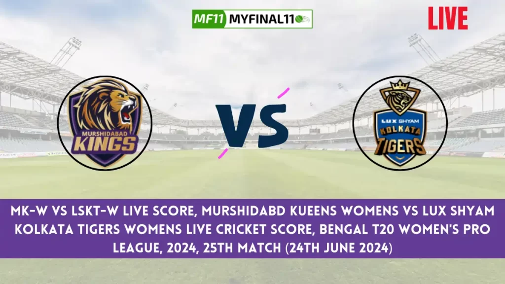 Get live score updates for the MK-W vs LSKT-W match as Murshidabd Kueens Womens (MK-W) take on Lux Shyam Kolkata Tigers Womens (LSKT-W) in the 25th Bengal Women’s Pro T20 League, 2024 match. Follow the live score and ball-by-ball commentary here. The match will begin on June 24th, 2024, at 09:00 AM MK-W and LSKT-W will be hosted at Jadavpur University Campus, Kolkata. Live Streaming of this match is available on Fancode, and for Live Cricket scorecard ball-by-ball commentary, Visit Here.