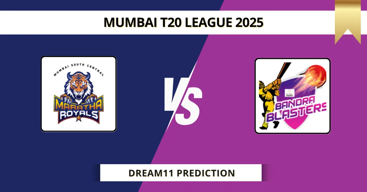 MSCMR vs BB Dream11 prediction – Get ready for an exciting clash as Mumbai South Central Maratha Royals (MSCMR) take on Namo Bandra Blasters (BB) in Match 17 of the T20 Mumbai 2025. The match is scheduled at Dr DY Patil Sports Academy, Mumbai on June 8, 2025, 10:30 AM IST.