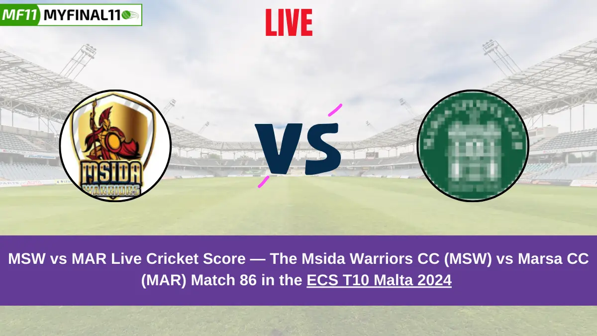MSW vs MAR Live Cricket Score — The Msida Warriors CC (MSW) vs Marsa CC (MAR) Match 86 in the ECS T10 Malta 2024 is set for November 12, 2024, at 5:00 PM IST, at Marsa Sports Club.
