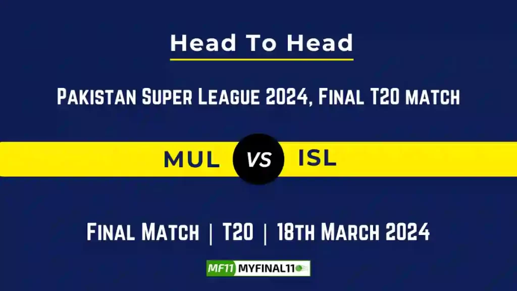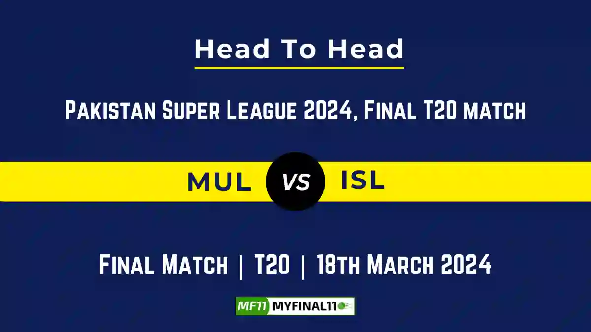 MUL vs ISL Head to Head, MUL vs ISL player records, MUL vs ISL player Battle, and MUL vs ISL Player Stats, MUL vs ISL Top Batsmen & Top Bowlers records for the Upcoming Pakistan Super League 2024, Final Match, which will see Multan Sultans taking on Islamabad United, in this article, we will check out the player statistics, Furthermore, Top Batsmen and top Bowlers, player records, and player records, including their head-to-head records.
