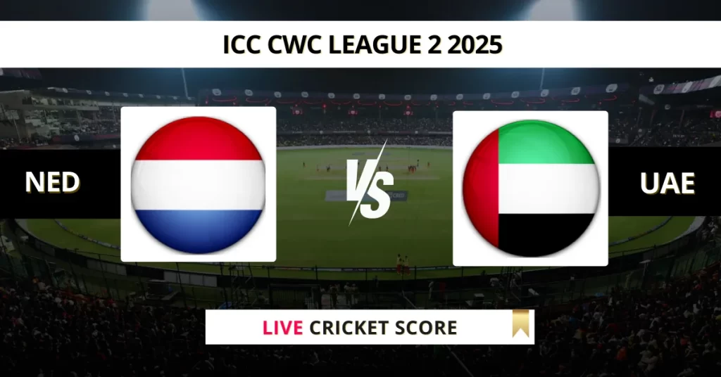 NED vs UAE Live Cricket Score — The Netherlands (NED) vs United Arab Emirates (UAE) Match 62 in the ICC CWC League 2 2025 is set for May 6, 2025, 2:30 PM IST, at VRA Cricket Ground.