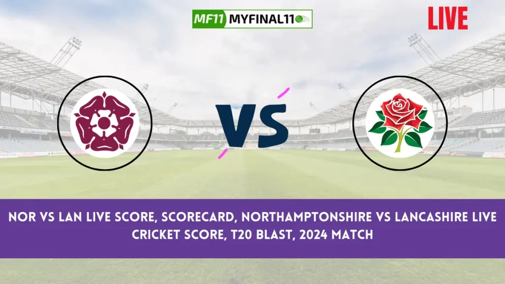 NOR vs LAN Live Score — Today’s English T20 Blast 2024 T20 match between Northamptonshire (NOR) and Lancashire (LAN) will be held on July 5th, 2024, at County Ground, Northampton. It will start at 11:00 PM IST. Cricket fans can follow the live cricket score, scorecard, and ball-by-ball match commentary on myfinal11. Live streaming for this match is available on the Fancode app/website.