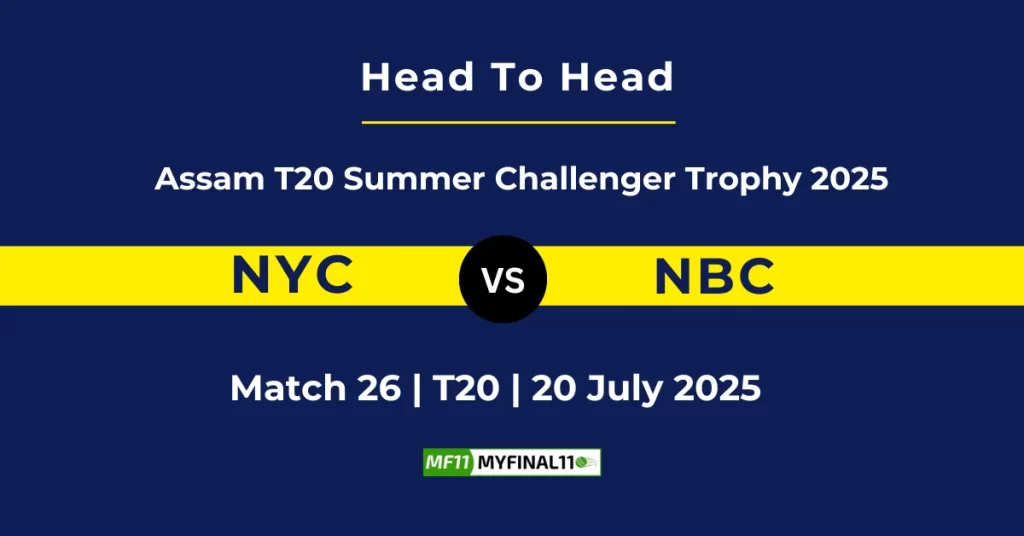 NYC vs NBC Player Battle, Head-to-Head Team Stats & Records and more: Today in Assam T20 Summer Challenger Trophy (2025), 91 Yard Club (NYC) will take on Nabajyoti Club (NBC) at Judges Field, Guwahati, on 20th July 2025 at 1:30 PM.