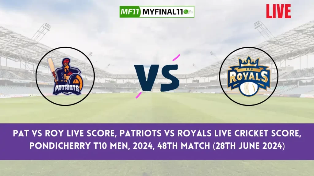 Get live score updates for the PAT vs ROY match as Patriots (PAT) take on Royals (ROY) in the 48th Pondicherry T10 Men, 2024 match. Follow the live score and ball-by-ball commentary here. The match will begin on June 28th, 2024, at 02:00 PM IST and will be hosted at Cricket Association Puducherry Ground 4, Puducherry. Live Streaming of this match is available on the Fancode, and for PAT vs ROY Live Cricket scorecard ball-by-ball commentary, Visit Here.