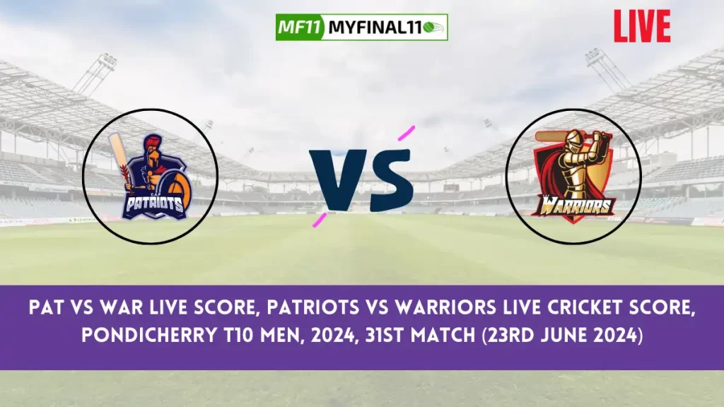 Get live score updates for the PAT vs WAR match as Patriots (PAT) take on Warriors (WAR) in the 31st Pondicherry Men’s T10, 2024 match. Follow the live score and ball-by-ball commentary here. The match will begin on June 23rd, 2024, at 08:30 AM IST and will be hosted at Cricket Association Puducherry Ground 4, Puducherry. Live Streaming of this match is available on the Fancode, and for PAT vs WAR Live Cricket scorecard ball-by-ball commentary, Visit Here.