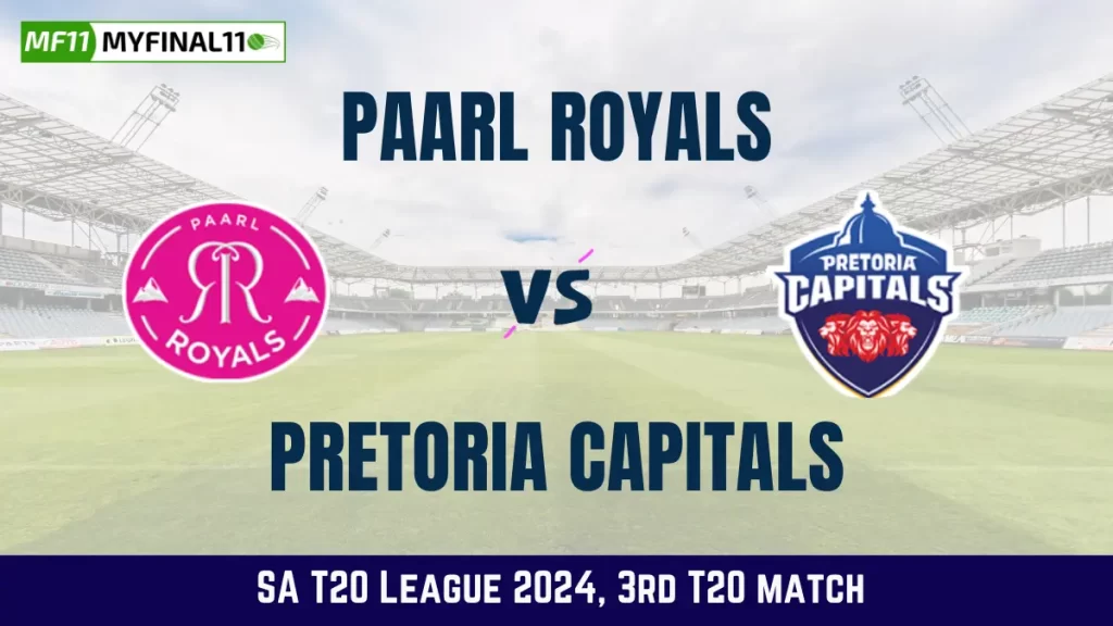 PR vs PRC Live Score Today PR vs PRC Live scorecard Live Cricket Score report & scorecard, SA T20 League, 2024 Catch live cricket score, ball-by-ball commentary, & highlights of the 3rd Match of SA T20 League, 2024 – Paarl Royals is set to take on Pretoria Capitals at St George’s Park, Port Elizabeth at 09:00 PM IST. If you are looking for Today’s PR vs PRC live cricket score then you are at the right place.