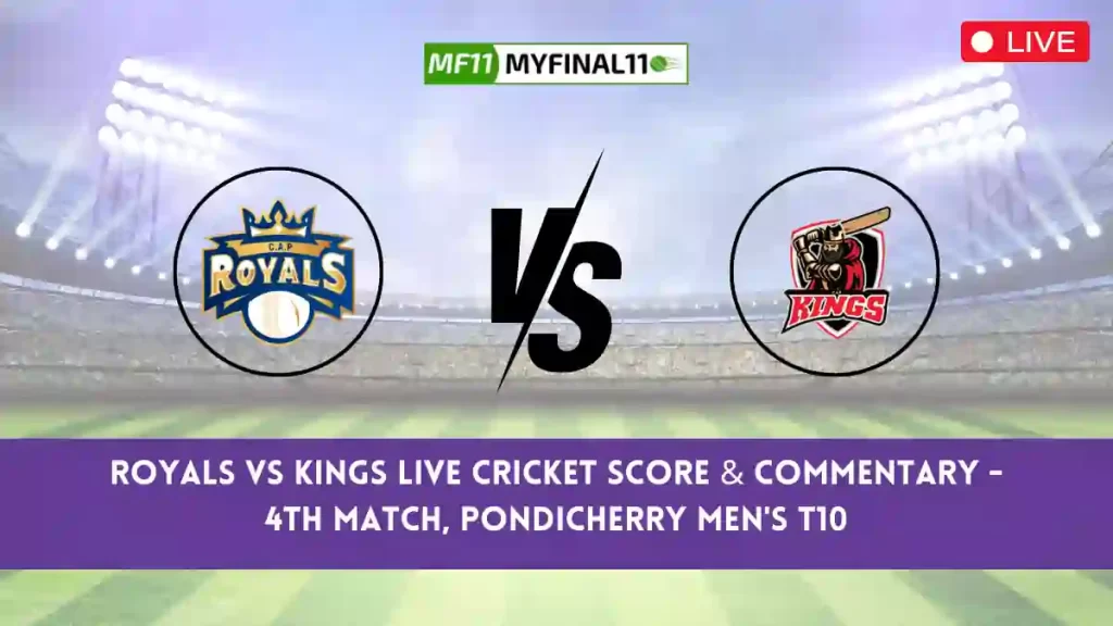 Get live score updates for the ROY vs KGS live score match as Royals (ROY) take on Kings (KGS) in the 4th match of the Pondicherry T10 Men 2024. Follow the live score and ball-by-ball commentary here. The match will begin on June 14, 2024, at 08:30 AM IST and will be hosted at Cricket Association Puducherry Ground 4, Puducherry. Live Streaming of this match is available on the Fancode, and for ROY vs KGS Live Score, Cricket scorecard ball-by-ball commentary, Visit Here.