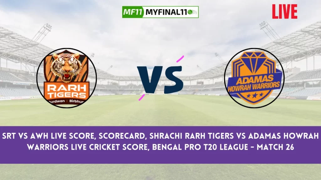 SRT vs AWH Live Score – Today’s 26th Bengal Pro T20 League match between Shrachi Rarh Tigers (SRT) and Adamas Howrah Warriors (AWH) will be held on June 24, 2024, at Eden Gardens, Kolkata. It will start at 01:00 PM IST. Cricket fans can follow the SRT vs AWH live cricket score, scorecard, and ball-by-ball match commentary on myfinal11. Live streaming for this match is available on the Fancode app/website.
