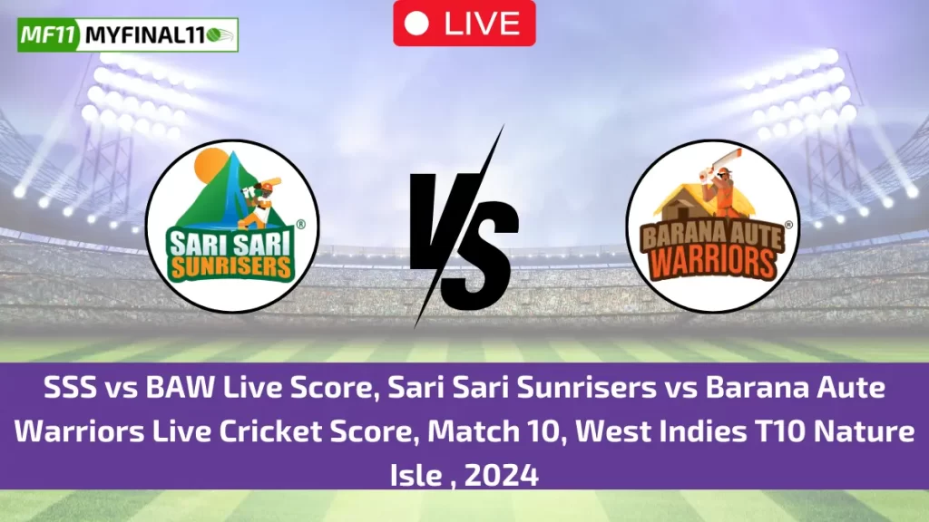 SSS vs BAW Live Score: The upcoming match between Sari Sari Sunrisers (SSS) vs Barana Aute Warriors (BAW) at the West Indies T10 Nature Isle, 2024 tournament is expected to be thrilling. The SSS vs BAW match will be held on June 27, 2024, at Windsor Park, Roseau. It will start at 9:30 PM IST. Cricket fans can follow the SSS vs BAW live cricket score, scorecard, and ball-by-ball match commentary on myfinal11. Live streaming for this match is available on the Fancode app/website.