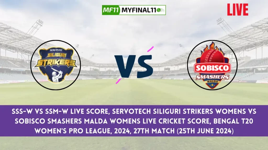Get live score updates for the SSS-W vs SSM-W match as Servotech Siliguri Strikers Womens (SSS-W) take on Sobisco Smashers Malda Womens (SSM-W) in the 27th Bengal Women’s Pro T20 League, 2024 match. Follow the live score and ball-by-ball commentary here. The match will begin on June 25th, 2024, at 09:00 AM SSS-W and SSM-W will be hosted at Jadavpur University Campus, Kolkata. Live Streaming of this match is available on Fancode, and for Live Cricket scorecard ball-by-ball commentary, Visit Here.