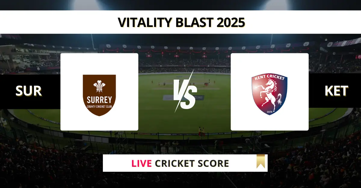 Watch the action unfold in SUR vs KET – Vitality Blast 2025, Match 40. Live scores and match highlights coming straight from Kennington Oval on June 12, 2025, 11:00 PM IST.