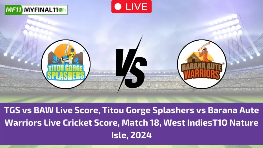 TGS vs BAW Live Score: The upcoming match between Titou Gorge Splashers (TGS) vs Barana Aute Warriors (BAW) at the West Indies T10 Nature Isle, 2024 tournament is expected to be thrilling. The TGS vs BAW match will be held on Jully 1, 2024, at Windsor Park, Roseau. It will start at 12:00 AM IST. Cricket fans can follow the TGS vs BAW live cricket score, scorecard, and ball-by-ball match commentary on myfinal11. Live streaming for this match is available on the Fancode app/website.