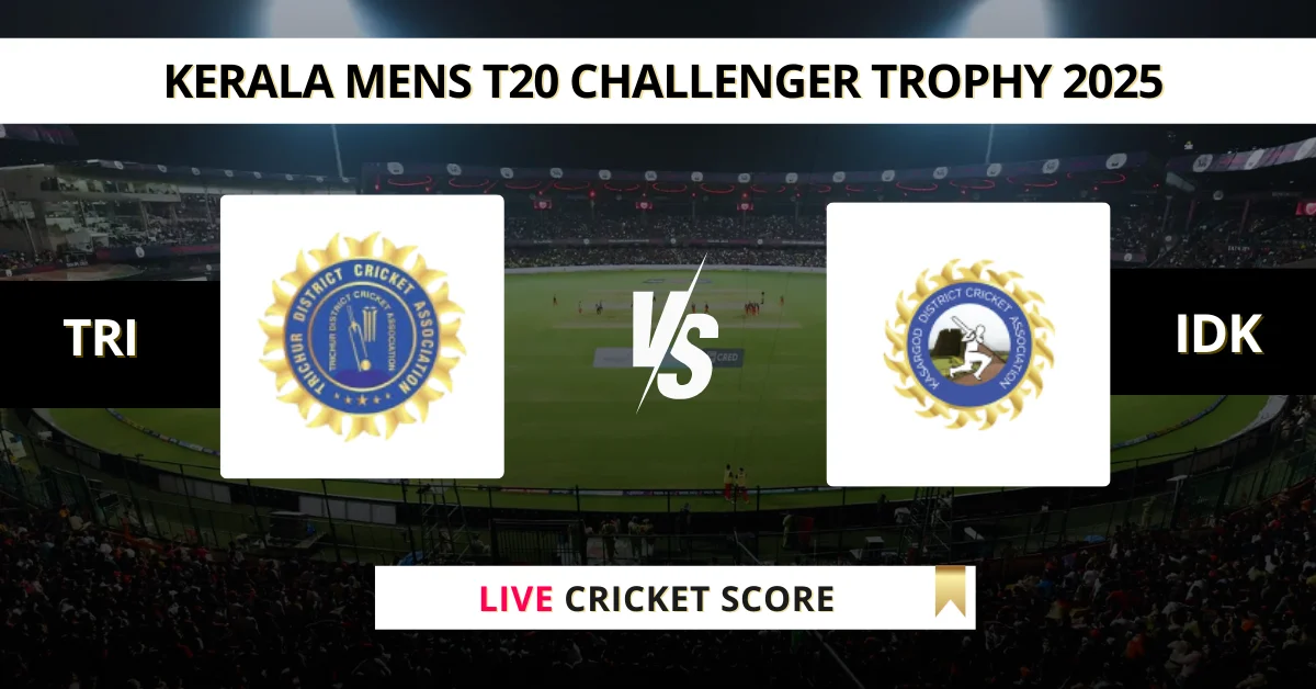 TRI vs IDK Live Cricket Score — The DCA Thrissur (TRI) vs DCA Idukki (IDK) Match 4 in the Kerala Men’s T20 Challenger Trophy 2025 is set for May 17, 2025 1:00 PM IST, at St Xavier’s College Ground.