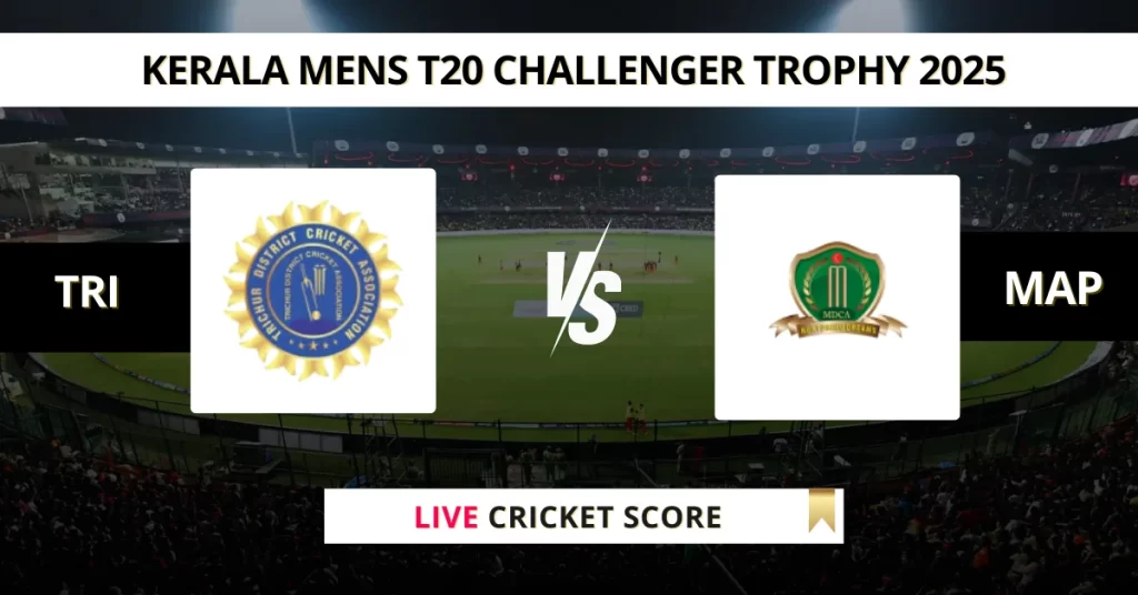 TRI vs MAP Live Cricket Score — The DCA Thrissur (TRI) vs DCA Malappuram (MAP) Match 9 in the Kerala T20 Men’s Challenger Trophy 2025 is set for May 20, 2025, 8:45 AM IST, at St Xavier’s College Ground, Thiruvananthapuram.