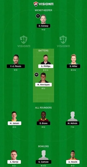 - While in the bowling department – Rusty Theron, Calvin Savage Gerald Coetzee, Mitchell Santner, Dwayne Bravo and Mohammad Mohsin have the duty of plucking wickets.