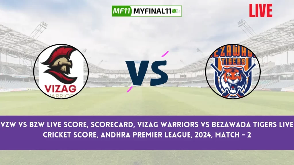 VZW vs BZW Live Score — Today’s 2nd Andhra Premier League T20 match between Vizag Warriors (VZW) and Bezawada Tigers (BZW) will be held on July 1, 2024, at Dr. Y.S. Rajasekhara Reddy ACA-VDCA Cricket Stadium, Visakhapatnam. It will start at 02:00 PM IST. Cricket fans can follow the live cricket score, scorecard, and ball-by-ball match commentary on myfinal11. Live streaming for this match is available on the Fancode app/website.