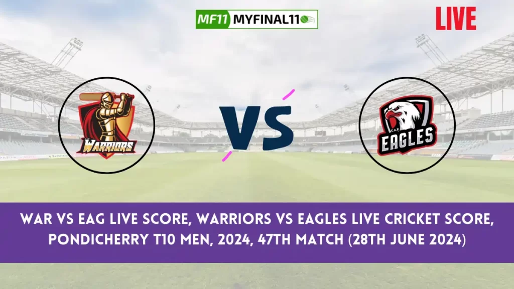 Get live score updates for the WAR vs EAG match as Warriors (WAR) take on Eagles (EAG) in the 47th Pondicherry T10 Men, 2024 match. Follow the live score and ball-by-ball commentary here. The match will begin on June 28th, 2024, at 11:30 AM IST and will be hosted at Cricket Association Puducherry Ground 4, Puducherry. Live Streaming of this match is available on the Fancode, and for WAR vs EAG Live Cricket scorecard ball-by-ball commentary, Visit Here.