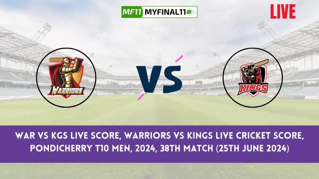 Get live score updates for the WAR vs KGS match as Warriors (WAR) take on Kings (KGS) in the 38th Pondicherry T10 Men, 2024 match. Follow the live score and ball-by-ball commentary here. The match will begin on June 25th, 2024, at 11:30 AM IST and will be hosted at Cricket Association Puducherry Ground 4, Puducherry. Live Streaming of this match is available on the Fancode, and for WAR vs KGS Live Cricket scorecard ball-by-ball commentary, Visit Here.