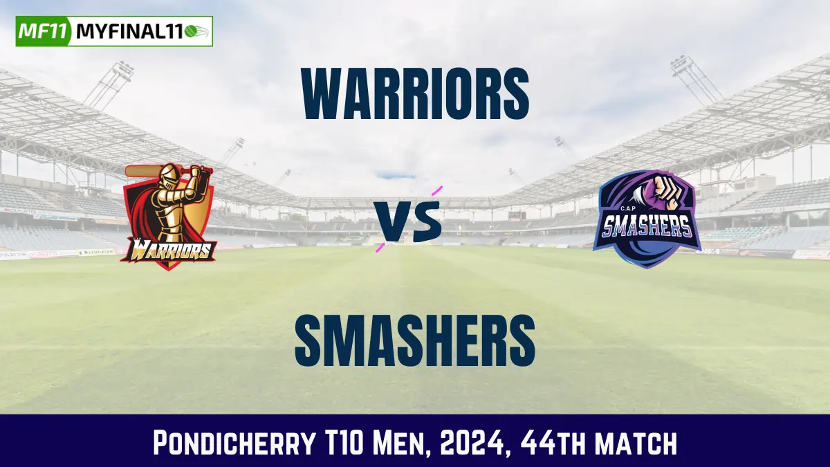 The 44th match of the Pondicherry T10 Men 2024 will be between Warriors (WAR) and Smashers (SMA) at Cricket Association Puducherry Ground 4, Puducherry on 27th June 2024 at 11:30 AM IST. If you are interested, you can find more information about the WAR vs SMA Dream11 Prediction Today Match, WAR vs SMA Dream11 Team Today, Playing 11, and Pitch Report & WAR vs SMA Player Stats in this article.