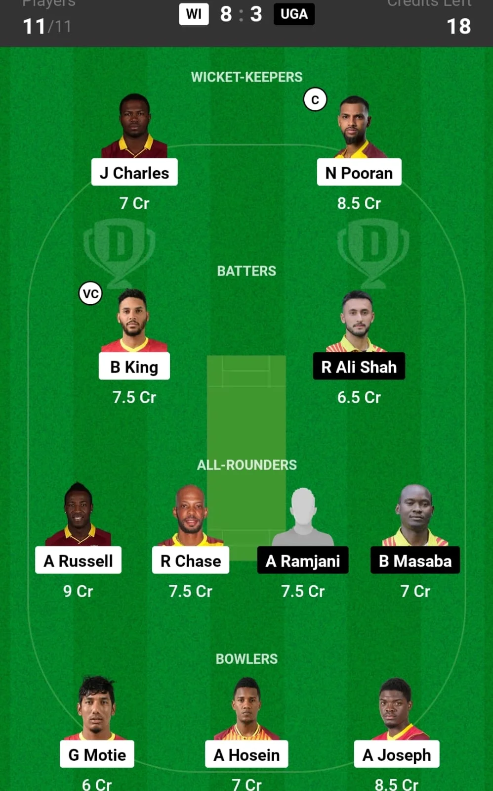The 18th match of ICC Men’s T20 World Cup 2024 will be played between the West Indies (WI) and Uganda (UGA) at Providence Stadium, Guyana, Providence, on 9th June 2024 at 6:00 AM IST. If you are interested, you can find more information about the WI vs UGA Dream11 Prediction Today Match, WI vs UGA Dream11 Team Today, Playing 11s, Pitch Report & WI vs UGA Player Stats in this article.